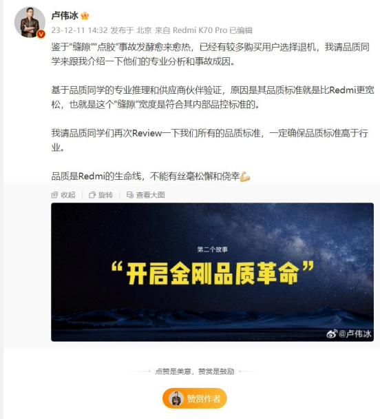 事情的起因是卢伟冰发的一条微博,就近期新机“缝隙”“点胶”事故请专业员工作出专业分析和事故成因。引发部分网友晒图,多为一加12机型。