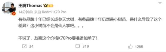 王腾发文称:“有些品牌十年已经长成参天大树,有些品牌十年仍然是小树苗,是什么导致了这个差异?这小树苗不会是仙人掌吧。不说了,友商这个价格K70Pro要准备加单了!”他的这一番话自然也是对李杰在发布会上的言论进行了回应。毫无疑问,前者自然是指今年刚刚11岁的小米,而后者则是指在发布会上称自己小树苗的一加了。