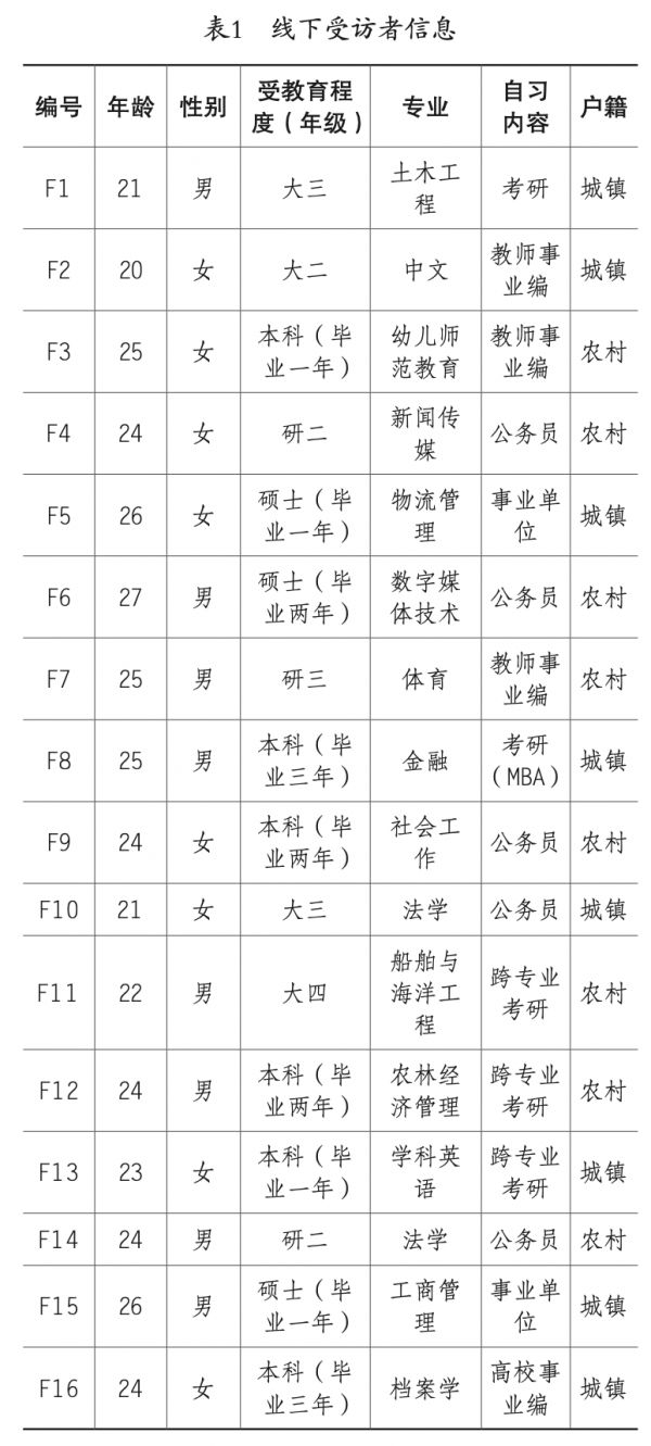 选择付费自习室的有高校在读学生,也有已经工作的年轻人,他们绝大多数准备考编、考研,也有一些备考相关行业的资格证书。研究者加入自习室微信群,作为有“考研”与“考编”经历的过来人参与自习室微信群和线下公共空间的讨论,对自习室成员进行观察,选择合适的访谈对象。共有16位自习室成员(8位男性,8位女性)接受访谈(具体信息见表1),他们中有高校在读本科生,也有毕业不久的职场新人,每位接受70~90分钟的访谈(F编号为线下访谈对象)。