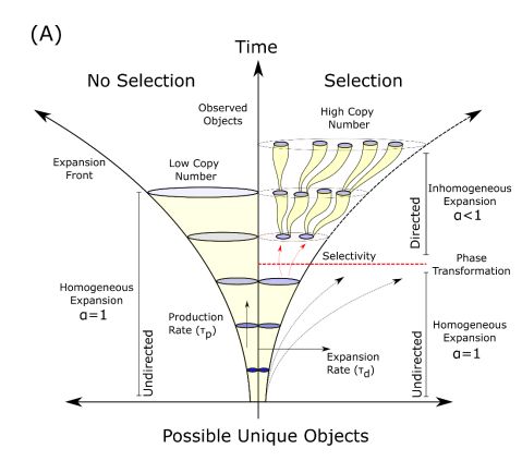 一个物体被组装的步骤越多,就需要经历越多的自然选择才能出现。因此,将组装指数和拷贝数组合起来便得到了一个方程,该方程确定了生成对象集合所必要的选择量,也就是说,从无选择到选择的过渡,例如无生命物质到有生命这一关键转变时刻,这是以一种数学上可定义的方式改变了组装中的路径,可通过该方程来体现。实质上,同时具有高组装指数和高拷贝数的对象物体便是“选择”发生作用的证据[5]。