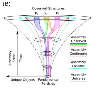 首先范围最大的是组装宇宙(Assembly Universe)中,基本构造模块的所有排列都是允许的。其次是可能组装宇宙(Assembly Possible)中,物理定律对这些组合施加约束,因此只有一些物体是可行的。然后,偶然组装宇宙(Assembly Contingent)通过挑选那些实际上可以沿可能路径组装的物体,对物理上允许的大量物体进行削减。第四个宇宙是观测组装宇宙(Assembly Observed),它只包括那些生成我们实际看到的特定对象的组装过程。