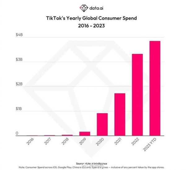 抖音不仅是全球第五个达成该成就的App,更是唯一一个非游戏应用。与此同时,2023年迄今为止,抖音的内购收入已经超过38亿元,较年初的数据增长61%,仍在以极快的速度攀升。