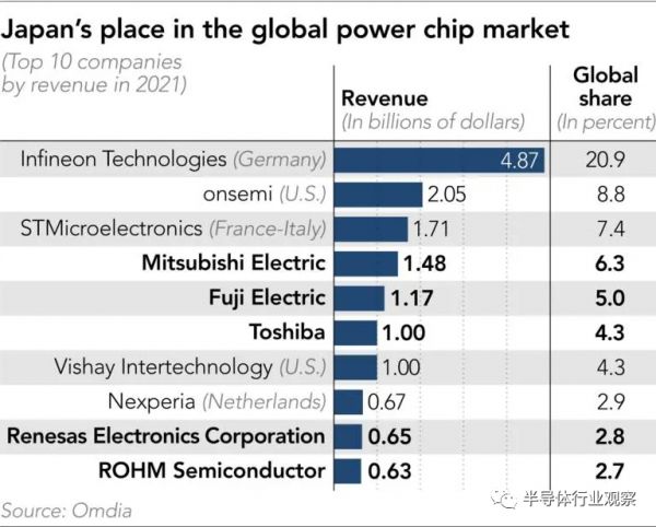 虽然在整个半导体领域,日本企业被认为陷入低迷,但是放眼整个功率半导体领域,日本仍存在感十足。据Omdia 2021年数据显示,全球功率芯片十强中有一半是日企,三菱电机(第4)、富士电机(第5)、东芝(第6)、瑞萨(第9)、ROHM(第10)。这五家企业合计占有全球20%以上的功率芯片市场份额。