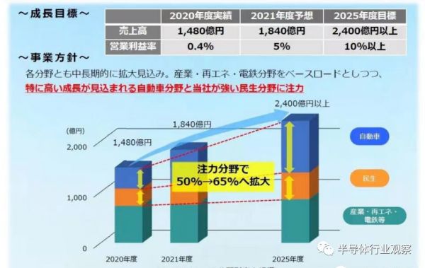 2021年11月,三菱电机设立公司功率器件业务目标时表示,到2025年销售额2400亿日元以上、营业利润率10%以上。为实现目标,三菱电机宣布将在未来五年内向功率半导体业务投资1300亿日元,计划在福山工厂新建一条12英寸晶圆生产线,并计划到2025年将其产能比2020年翻一番。