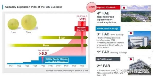 据悉,罗姆计划在2028年3月底前向SiC注入5100亿日元发展碳化硅产业链。目标是到2030年SiC晶圆产能相比2021年提高35倍,据悉,到2025年罗姆SiC产能将提升6.5倍。