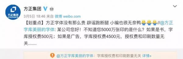 如此“惨状”一度引发网友热议。但昨日(3月5日)下午,认证为“北京北大方正电子有限公司”的微博帐号@方正字库美丽的字体 回应称,(字体)授权费和印刷数量没有关系,书的授权费为500元,广告是4500元。