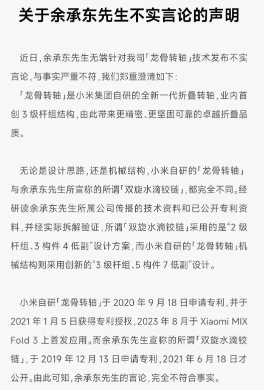 对此小米声称,其自研的龙骨转轴技术与余承东所提及的双旋水滴铰链完全不同,而且小米的技术在2020年9月已经申请了专利,并在2023年1月获得了专利授权,于Xiaomi MIX Fold3上首次应用。小米要求余承东遵循“科学与严谨”的基本规则,不要再抹黑同行、误导公众。