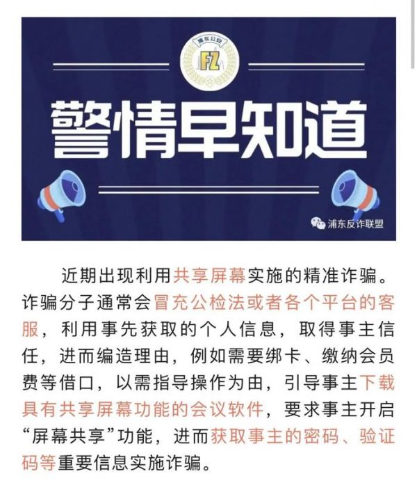 浦东反诈联盟还专门发布过一则提醒警惕利用共享屏幕实施精准诈骗
