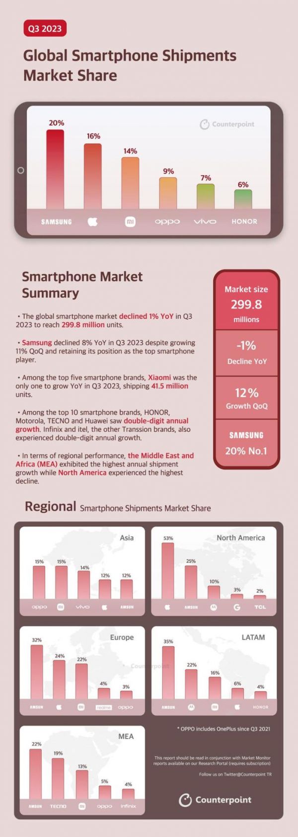 2023Q3全球手机市场战报:三星下降8%、小米在前五中唯一正增长