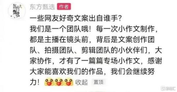 在评论区,东方甄选的官方账号置顶了一条评论,说每一次小作文制作,都是主播在镜头前,背后是文案创作团队、拍摄团队、剪辑团队,大家协作才有了一篇篇专场小作文。