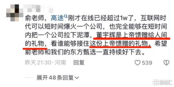 在董宇辉的评论区乃至俞敏洪的评论区下,都有不少董宇辉粉丝认为,董宇辉是东方甄选的救星,甚至是“上帝馈赠的礼物”。