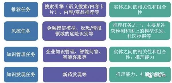 知识图谱的主要应用体现在几个方面:第一,推荐任务,像经常使用的搜索引擎及类似于今日头条内容性的搜索都是推荐类的任务;第二,风控任务,包括金融授信模型、反恐还有情报领域的危险识别,比如美国的Palantir公司用知识图谱识别本拉登的线索,都属于风控任务;第三,知识管理类的任务,如问答、客服等等;第四,知识发现类任务。