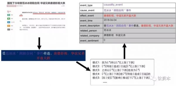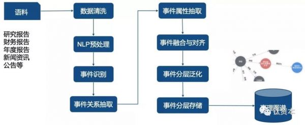 上图是流程示意图。从各种研究报告、财务报告、公告、新闻资讯中提取出来语料,经过一定的数据清洗、预处理后做事件识别,再做相关关系的属性抽取。还要做融合与对齐,就是一个事件不同的人会有不同的表达方式,要找出这些不同的表达方式,再融合成同一个表达方式。