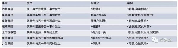 根据事件之间的关系划分,可以把事理划分为几类。一类是因果事理,占据了描述逻辑的80%左右,形式都是A导致B。除此之外,还包括条件、反转、顺承、上下位等类事理,每种都是人经常会使用的逻辑模式。