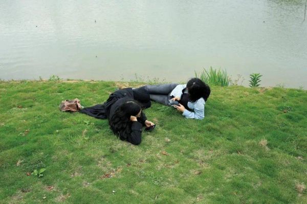 2023年2月11日,杭州。躺在河边玩手机的人。(图/阿灿)