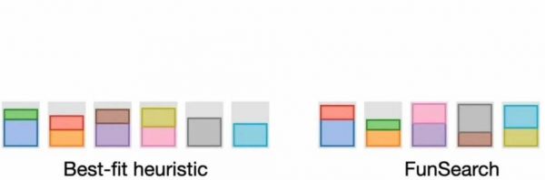 装箱问题中,FunSearch比传统方式(左)更高效,可以用更少的箱子装入同样数量的物体