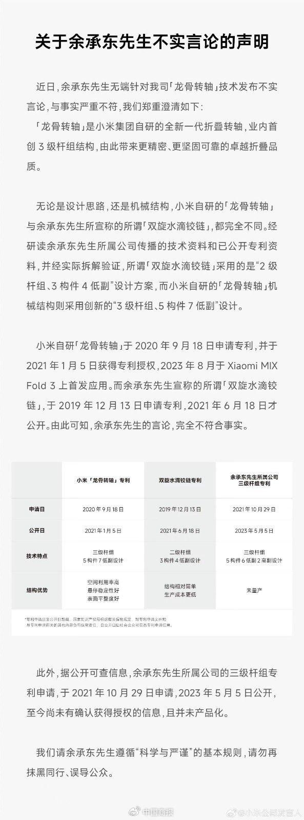 小米表示,小米自研“龙骨转轴”于2020年9月18日申请专利,并于2021年1月5日获得专利授权,2023年8月于Xiaomi MIX Fold 3上首发应用。而余承东宣称的所谓“双旋水滴铰链”,于2019年12月13日申请专利,2021年6月18日才公开。“由此可知,余承东先生的言论完全不符合事实。”