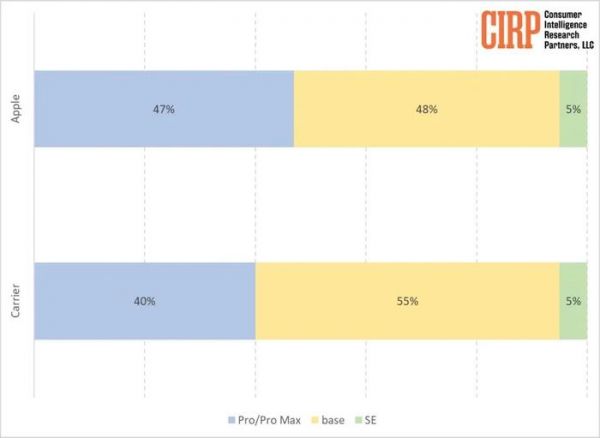 相比较而言,通过运营商渠道,购买 iPhone Pro 或者 Pro Max 机型的用户数量占比为 40%。