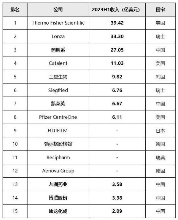 目前,全球CDMO市场的格局是,美国的Thermo Fisher Scientific(赛默飞世尔科技),瑞士的Lonza(龙沙)、中国的药明系位居前三,美国的Catalent、韩国的三星生物排名第四和第五。