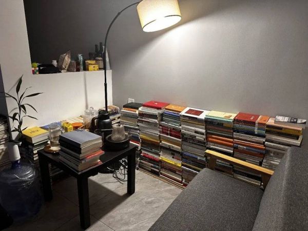 ▲ 天胡搬进新家后,码在墙边的四百多本书。