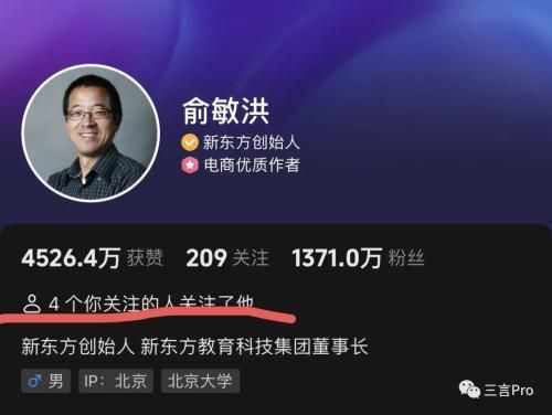 再用同样的逻辑,验证董宇辉是否关注俞敏洪。三言先取关董宇辉,然后查看俞敏洪账号,此时可以看到俞敏洪个人主页提示“4个你关注的人关注了他”。