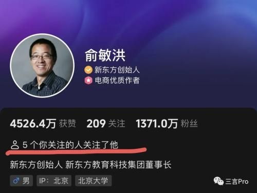 三言关注董宇辉后,再看俞敏洪个人主页,提示变成“5个你关注的人关注了他”,意味着董宇辉目前关注俞敏洪。
