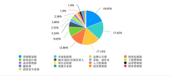 3、地产条线上,约20%来自营销策划部,18%的问卷填写者来自市场客研部,另有17%的人为品牌公关,13%的人来自投资拓展岗,以及约9%的研发设计岗。少部分来自工程管理、成本管理、人力资源、融资、财务、招采、客服关系、投资者关系等部门。