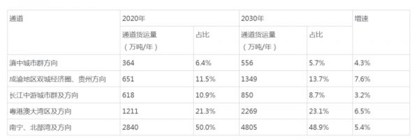 当地预测,到2030年,成渝地区双城经济圈、贵州方向的通道货运量将高达1349万吨/年,相较2020年翻倍;南宁、北部湾方向的通道货运量将达到4805万吨/年,占比达到48.9%。
