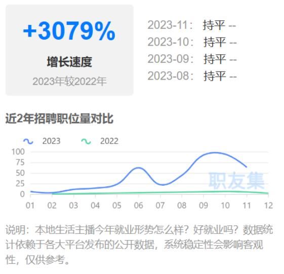 据运营社观察,在抖音像这样同类型的 MCN 批量存在。一个很显著的特征是,招聘平台上,生活服务类主播(达人)的岗位数量正在明显增长,2023 年是 2022 年的 30倍,且工资也相对可观。