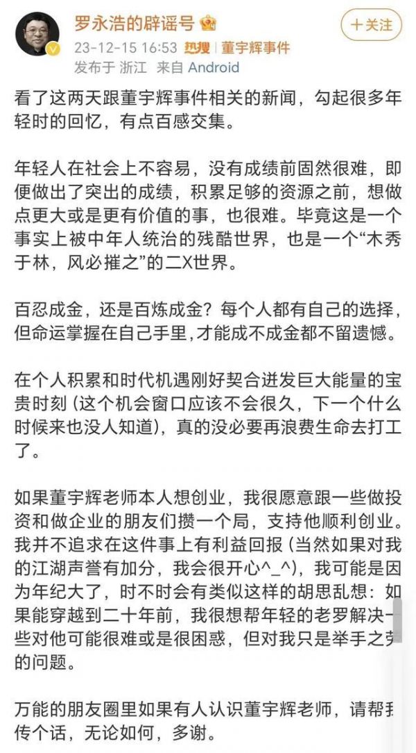 12月15日,罗永浩先是发布微博,提到对东方甄选近期风波的看法。
