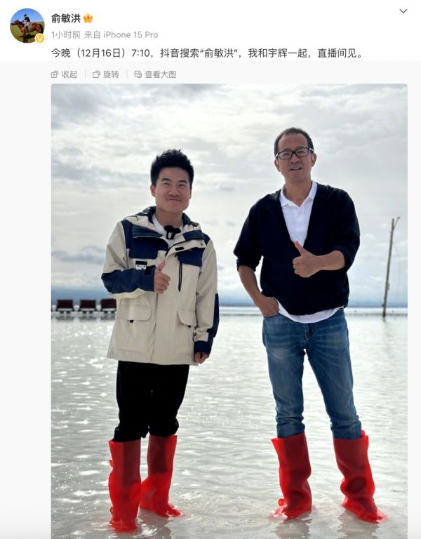 12月16日晚,俞敏洪在微博预告,“今晚(12月16日)7:10,我和宇辉一起,直播间见。”