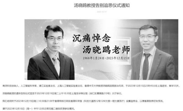 12月16日傍晚,商汤科技于公众号发布公司创始人汤晓鸥讣告:“我们怀着无比沉重的心情,向大家宣布一则令人悲痛的消息:我们敬爱的创始人、人工智能科学家、浦江实验室主任、上海人工智能实验室主任、香港中文大学教授汤晓鸥因病救治无效,于2023年12月15日23时45分,永远离开了我们。”