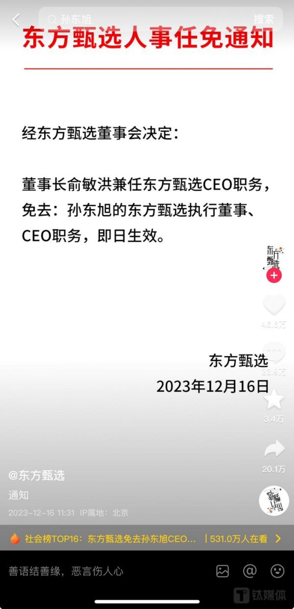 12月16日,东方甄选抖音官方账号发布通知免去孙东旭CEO一职