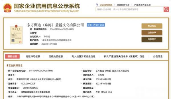 10月16日,东方甄选(珠海)旅游文化有限公司,法定代表人为孙东旭。