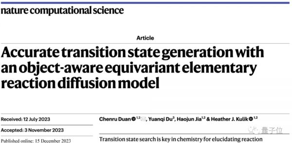 本文来自微信公众号:量子位 (ID:QbitAI),作者:萧箫,文章链接:C. Duan*, Y. Du, H. Jia, and H. J. Kulik, “Accurate transition state generation with an object-aware equivariant elementary reaction diffusion model”, Nat. Comput. Sci., ASAP, https://rdcu.be/dtGSF; https://www.nature.com/articles/s43588-023-00563-7