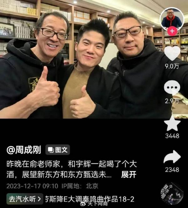 12月16日晚,俞敏洪和董宇辉双双现身俞敏洪“老俞闲话”直播间,坦诚回应风波。董宇辉表态不会离职,俞敏洪也解释了孙东旭被免职CEO后将依然“为东方甄选做贡献”。17日早上,新东方教育科技集团CEO周成刚发文称“昨晚在俞老师家,和宇辉一起喝了个大酒,展望新东方和东方甄选未来的发展,两个老头,一个年轻人”,并配上三人在俞敏洪家“喝大酒”的照片。事件终于尘埃落定。
