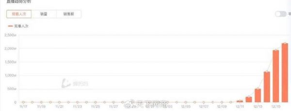 据蝉妈妈数据,12月高途佳品总计涨粉超过100万,直播间在线人数最高达到18万,直播日观看人次从原本的寥寥无几,到12月16日超过2000万人次,直播日销售额也在15日冲上了1200万元。