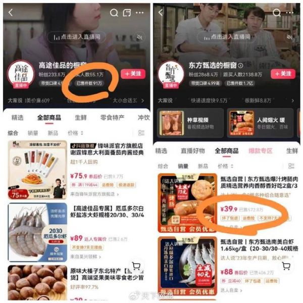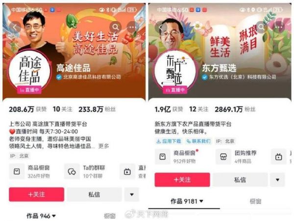 首先,从渠道布局来看,东方甄选不仅在抖音上开设有8个账号,也入驻了淘宝直播,并自行搭建了APP,将社媒流量导向自有平台。而高途佳品则主要经营抖音平台,目前仅有3个账号。