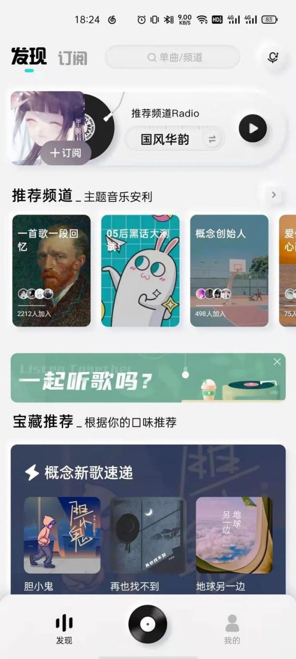 打开首页展示,能看到的内容都是与音乐相关的,推荐频道和宝藏推荐,看不到任何浮窗广告,横幅广告、以及任务入口等等,使用体验蹭蹭上涨。