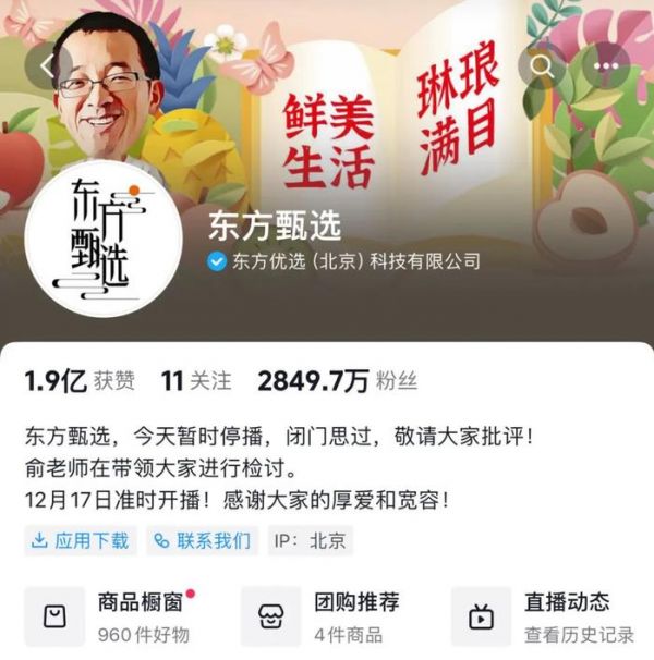 16日凌晨,东方甄选官方抖音账号更新简介,宣布当天暂时停播:“闭门思过,敬请大家批评!俞老师在带领大家进行检讨。”