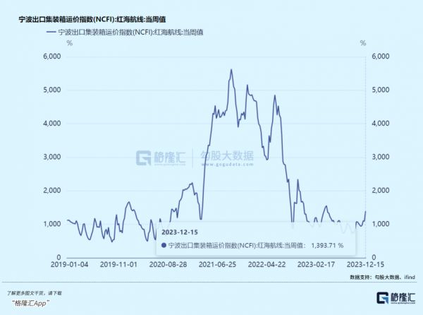 尤其是红海航线的订舱价格上涨更猛,12月15日当周宁波出口集装箱运价指数(NCFI)的红海航线指数环比飙升了27.7%,至1393.71点。