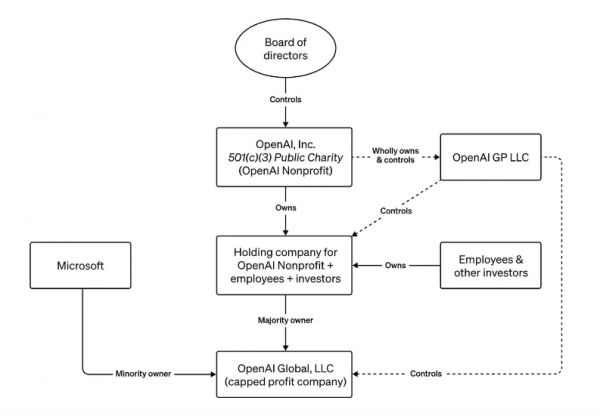 2018年,随着马斯克的退出,奥特曼创立了OpenAI现有的组织架构——由非营利组织及其理事会控制的一家营利性公司。
