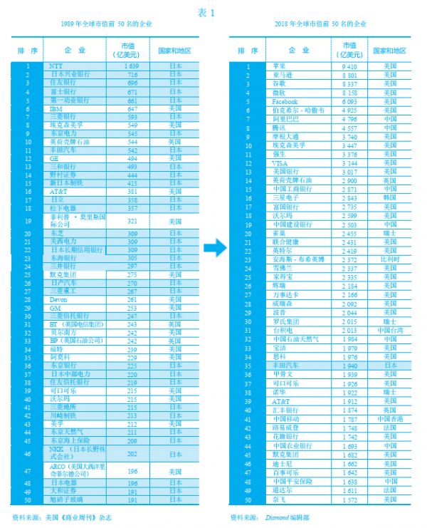 2018 年市值前 50 名的企业里竟然只剩丰田汽车一家日本企业了,只过了 30 年社会就发生了如此大的变化。