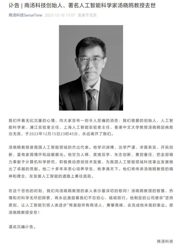 IT 之家 12 月 16 日消息,商汤科技创始人、人工智能科学家汤晓鸥于 2023 年 12 月 15 日 23 时 45 分不幸离世,享年 55 岁。
