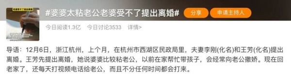 近日,一则题为“婆婆太粘老公,老婆受不了提出离婚”的新闻登上微博热搜,引起了网友的注意。