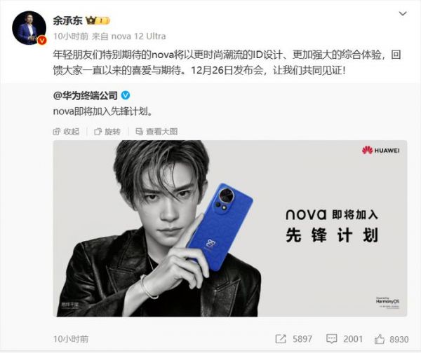 IT之家早些时候报道,余承东今日发文:年轻朋友们特别期待的 nova 将以更时尚潮流的 ID 设计、更加强大的综合体验,回馈大家一直以来的喜爱与期待。12 月 26 日发布会,让我们共同见证!