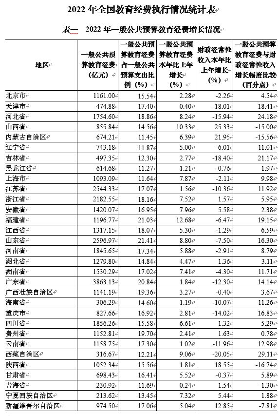 2022年各地教育经费执行情况,图源:官方网站截屏