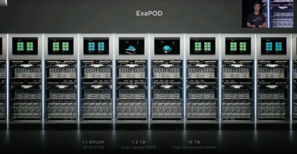 特斯拉自家的超算Dojo ExaPod,就是由多个Cabinet机柜组成,每个机柜里有多个训练单元,每个训练单元都封装了25个D1芯片。一整台ExaPod包含3000个D1芯片。