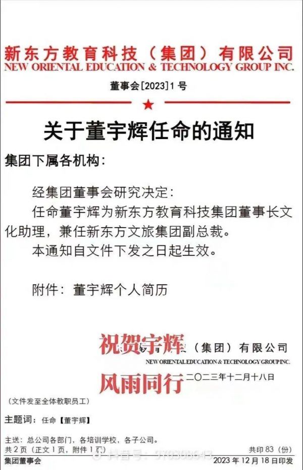 12月18日,俞敏洪也在其个人抖音账号中发布“关于董宇辉任命的通知”。内容显示,任命董宇辉为新东方教育科技集团董事长文化助理,兼任新东方文旅集团副总裁,即日生效。