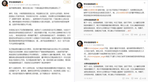 就在不少网友附和罗永浩的观点时,12月17日报道显示,俞敏洪在出席第四届中国职业教育发展论坛时表示,“老板必须心甘情愿地为员工打工,方向一致,就变成合伙人关系。”18日,俞敏洪直接发布了董宇辉的新人事任命。